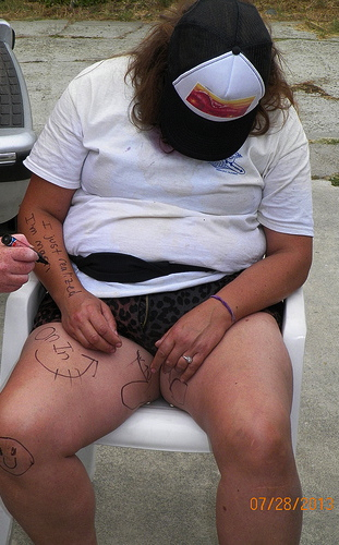 Puff the Magic Drag Queen finally showed up after sleeping in all morning like a lazy sod. Banana Basher couldn’t join us, so Puff took his place haring with Pearl Necklace. The W2B Hangover Hash trail is usually only a few blocks and literally ends across the street. Good thing Puff was well rested because his trail went all the way back to his house for beer check—a whole half mile! Maybe he could sneak in an extra nap during beer check. Hugh Heifer was a champ and carried Occasional along the trail. At least Occasional had made it back (semi-)alive from Over the Hill Gang, thanks to dBASED’s taxi. Poor Occasional was beer-stained, wine-stained and getting written on throughout beer check, so again dBASED got the car to ferry her back to the mansion and let her sleep it off.