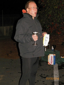 The pack headed out and followed the flour across Ocean St, through the courthouse parking lot to San Lorenzo Park.  I was the lone FRB at that point and some concerned homeless folks spotted me searching around for flour and asked if I was ok.   This took me off guard, since it seems more likely for them to ask me for spare change or if I want to get high.  There was a check on the river levee and the rest of the pack caught up with me.   Trail continued past the Warrior Arena, up the stairs to Beach Hill and down to the Boardwalk, over the train trestle, left on East Cliff Drive.  We crossed through a field and found beer check at Hugh’s friend Jim’s house on Pearl St.  727beercheckHugh really has a way with men!  This guy let us invade his yard, use his bathroom and cooked us a bunch of food!  Trail was 3.33 miles according to Occasional Rapist’s GPS.